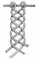 Самое простое плетение – косички-«плетешки» на четырех нитях. Плетение начинают слева направо. Первую нить набрасывают на вторую, затем заводят под четвертую и выводят на верх третьей. При плетении нити меняют местами, но всегда начало плетения начинается с первой левой, и так косичка плетется до нужной длины. В зависимости от нужной ширины «косичку» можно выплести на трех, четырех, шести, семи и более нитях. Принцип плетения такой же, как и на четырех нитях. Используется косичка для плетения поясов, галстуков, ремней. Плетеные косички, расположенные в шахматном порядке, дают интересное полотно, которое можно использовать, например, для оплетания сосудов и даже для плетения обуви! |